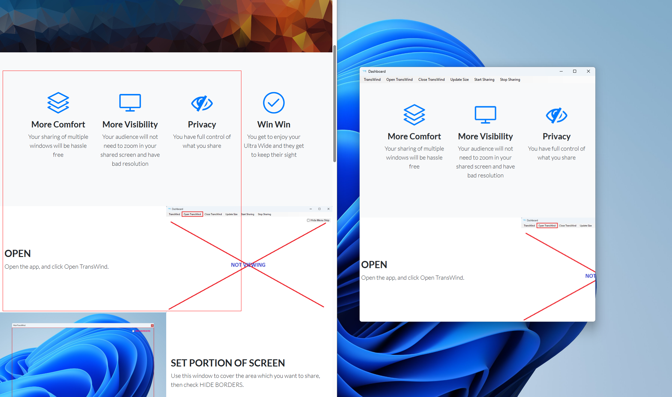 Control whether you want the Sharing Screen to be bigger than the TransWind Window.