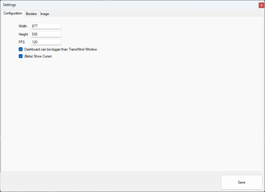 Set the default size of the TransWind Window, and the FPS (Frames per Second) that will be used while sharing.